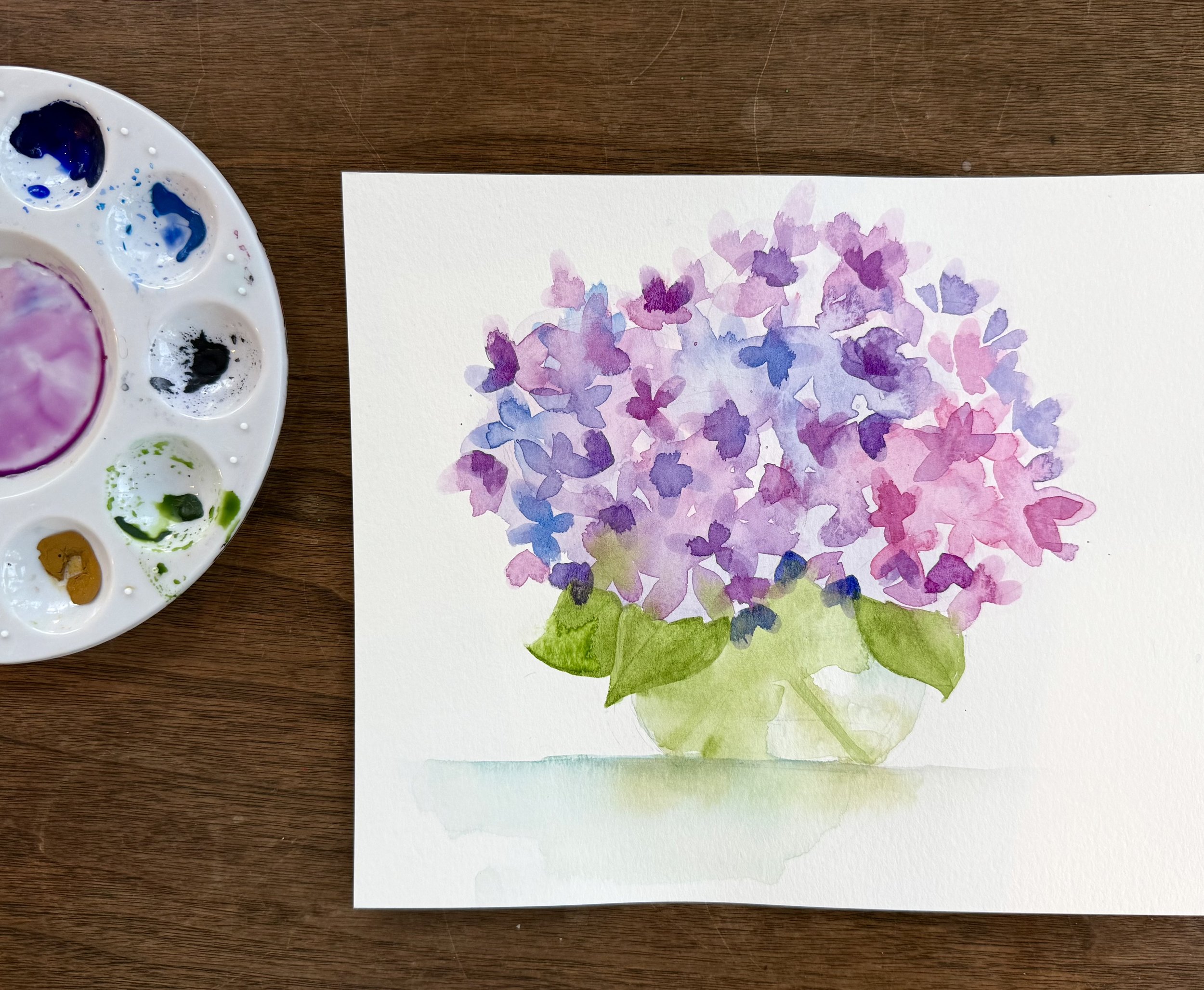 Let your creativity bloom! I’ll guide you step by step through painting a vase full of hydrangeas. We’ll practice layering, color-mixing, and softening edges. Whether you’re new to watercolor or already have experience, you’ll learn new techniques, have fun, and go home with a lovely watercolor painting!